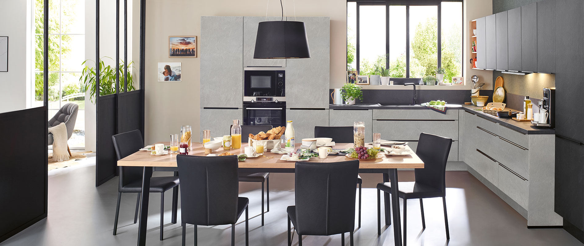 Couleur Qui Va Avec Une Cuisine Gris Mineral. Ici les murs de la salle à manger sont peints avec une magnifique peinture orange qui s'harmonisent et mettent en valeur les meubles. Une cuisine équipée aux lignes élégantes et épurées.